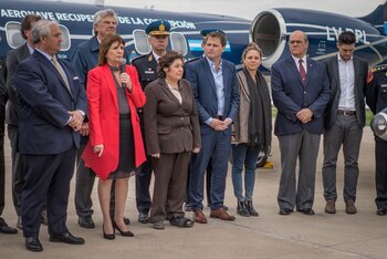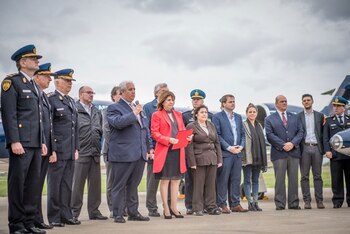 La Ministra de Seguridad de la Nación, Patricia Bullrich junto a Graciela Ocaña, candidata a diputada nacional por Cambiemos, Alex Campbell y Agustina Ciarletta, referentes de San Fernando y candidatos a ocupar una banca en el concejo deliberante, hicieron entrega formal a la Policía Federal del avión que perteneció a Lázaro Báez.