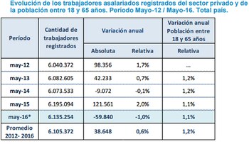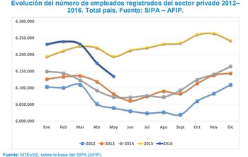 Según lo relevado por la Subsecretaría de Políticas, Estadísticas y Estudios Laborales del Ministerio de Trabajo, en mayo de 2016 se contabilizaron en el total país alrededor de 6,1 millones de trabajadores asalariados registrados en el sector privado. En la comparación interanual, se advierte una contracción de cerca de 59.840 asalariados formales con respecto al mismo mes del año anterior, lo cual implica una reducción anual del 1% del total de los trabajadores bajo relación de dependencia.