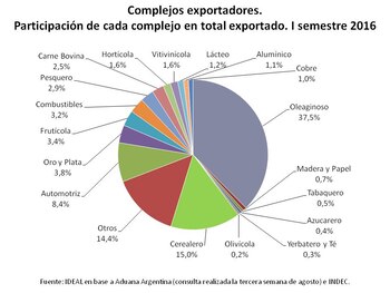 El complejo carne bovina representó 2,5% de las exportaciones totales, pero es muy importante por ser un sector intensivo en mano de obra. Conjuntamente con el complejo lácteo, son los que más empleo privado generan en el país, principalmente en la región centro y Buenos Aires, donde explican entre 10% y 15% de los puestos de trabajo. En el primer semestre de 2016, sus exportaciones aumentaron dos por ciento.