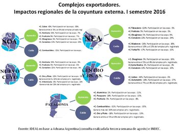 El complejo automotriz tiene un gran impacto en la región centro y Buenos Aires, tanto por el nivel de exportaciones como por la generación de empleo privado y su relación con actividades conexas. A nivel país, es el tercero que más exporta, 8,3 por ciento. Está pasando por una coyuntura muy adversa, por la crisis de Brasil (destino del 80% de las ventas del complejo) y la débil demanda interna. Sus exportaciones cayeron -28% en el primer semestre.