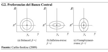 En cuanto a las preferencias del Banco Central, el gráfico G2 presenta las tres posibilidades que se pueden encontrar. En el panel B tenemos el Banco Central duro, que sólo se ocupa de tener los precios a raya sin consideración alguna sobre el producto. Como contraposición a este caso, está el Banco Central blando, que prioriza al nivel de empleo y ello se refleja en el panel C del gráfico.