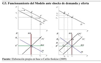 El modelo de metas de inflación consta de tres ecuaciones: (i) la curva IS, (ii) la curva de Phillips aumentada por expectativas de inflación y (iii) una función de pérdida social, de la cual se deriva la función de reacción de la política monetaria.