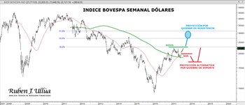 Creemos que actualmente sólo una eventual falla del índice Bovespa en dar superación a los 23 mil puntos en términos de dólares estará comprometiendo la condición de alza mayor directa hacia los próximos meses de este mercado. En tal caso deberemos saber que este mercado accionario se mostrará vulnerable, ya sea con posibilidades de recortar parcialmente las ganancias de los últimos meses y regresar hacia la zona de 20-19,5 mil puntos, o bien buscar instancias de soportes más deprimidas, en torno a los 17 mil puntos de índice, en términos de dólares, para que recién luego de ello la senda alcista de este mercado quede retomada y los objetivos de recuperación más ambiciosos arriba propuestos puedan ser finalmente conseguidos.