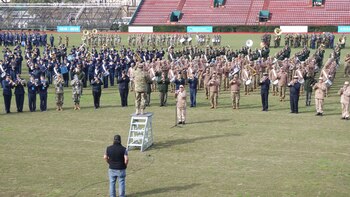 Aún no habían terminado de ocupar sus puestos de formación, cuando irrumpió en la platea de campo el ministro de defensa, Julio Martínez. Ya estaban en plena tarea el secretario general de ejército, General de Brigada Carlos Nogueria, junto a un grupo de oficiales y suboficiales de la fuerza. De a poco se fueron integrando representantes de la Armada y la Fuerza Aérea, como así también efectivos de las fuerzas de seguridad.
