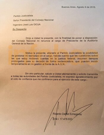 Ricardo Echegaray cumplió con el último paso formal que restaba para confirmar su salida de la Auditoría General de la Nación (AGN). En una carta dirigida a José Luis Gioja, puso su renuncia a disposición del Partido Justicialista, que este martes tenía previsto reunirse para elegir un sucesor.