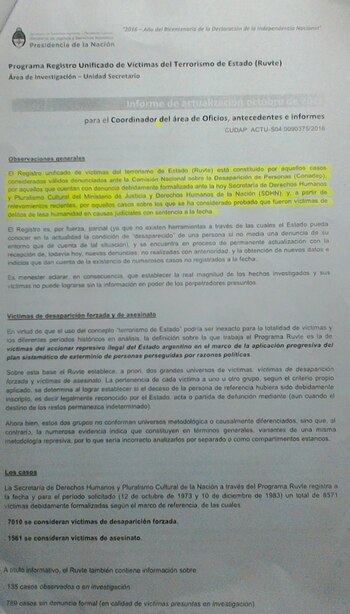 –Es una cifra emblemática que hay que respetar porque se trata de un tema muy doloroso. Pero los datos oficiales, tanto de la Conadep como estos, ya figuraban con la administración anterior y ayudan a construir la historia. Por eso repito: lo de las 6.348 víctimas no es un número definitivo.