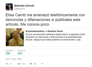 "Me advirtió que si publicaba ese artículo ella denunciaría que yo trabajo para Daniel Angelici, que me haría públicamente responsable de su seguridad y de lo que pudiera pasarle, y que mostraría todos los viajes que han hecho todos los diputados en la legislatura porteña en los últimos años", explicó Cerruti en una nota que lleva su firma.
