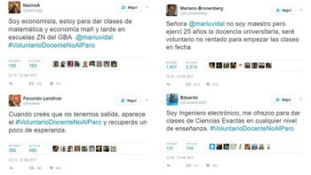 Una vez anunciado el paro, una sorprendente campaña invadió las redes sociales. Bajo el hashtag #VoluntarioDocenteNoAlParo, cientos de usuarios, entre quienes hay docentes jubilados y profesionales de distintas áreas que van desde la ingeniería hasta la educación física, se pusieron a disposición de las autoridades para garantizar las clases. Uno de ellos fue Mariano Bronenberg, relacionista público y consultor en comunicación. "No soy maestro, pero ejercí 25 años la docencia universitaria, seré voluntario no rentado para empezar las clases en fecha", anunció en un tuit que dirigió a la gobernadora bonaerense María Eugenia Vidal. En cuestión de minutos, las adhesiones comenzaban a multiplicarse.