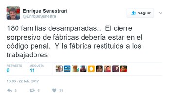 El jueves, sin ir más lejos, uno de los fiscales federales de Córdoba, Enrique Senestrari, apeló a Twitter para decir lo siguiente: "180 familias desamparadas… El cierre sorpresivo de fábricas debería estar en el Código Penal. Y la fábrica restituida a los trabajadores".