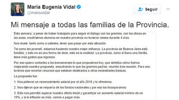 Tras el anuncio de un nuevo paro docente en la provincia de Buenos Aires, la gobernadora María Eugenia Vidal difundió un mensaje en las redes sociales dirigido a "todas las familias de la Provincia".