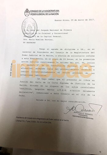 "Le hago saber que el presente se libra en función del fallo de la Corte Suprema de Justicia de la Nación, dictado en la víspera", reza la nota que está firmada por la presidente del Consejo, Adriana Donato.