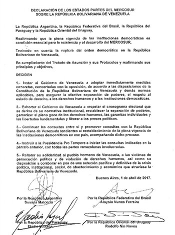 El documento firmado por los cuatro cancilleres insta "al Gobierno de Venezuela a adoptar inmediatamente medidas concretas, concertadas con la oposición, para asegurar la efectiva separación de poderes, el respeto del Estado de Derecho, los derechos humanos, y el respeto de las instituciones". En la práctica, esta es la aplicación del Protocolo de Asunción que contempla todo un proceso de consultas y exigencias al país que viole el orden constitucional como mecanismo previo a su expulsión.