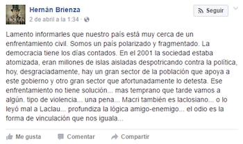 Luego de que su post tomara estado público, Brienza volvió a utilizar su muro de Facebook para dar su opinión sobre esa repercusión y sobre los comentarios que se generaron en los medios y las diferentes redes sociales: "Yo denuncio un estado de violencia discursiva generalizado y peligroso y los brutos en vez de pensar y reflexionar, en vez de entender lo que digo y parar la mano, como no saben leer ni comprender textos, me insultan, me agreden, se ponen violentos, me amenazan… y me acusan de algo que no entendieron…", escribió. Y, sobre el final, se lamenta: "Es muy difícil luchar contra la ignorancia y el autoritarismo en este país…"