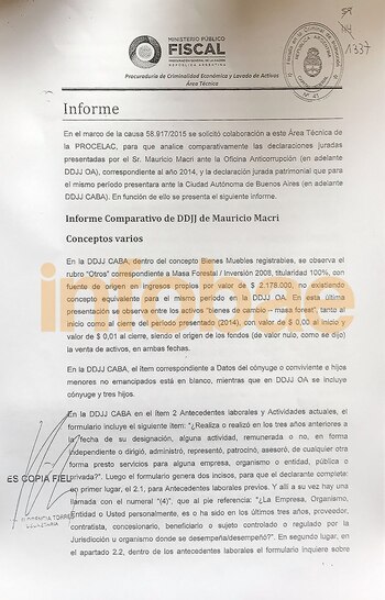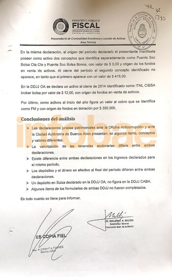 El informe se presentó a mediados de 2016 ante la fiscalía de Instrucción a cargo de Sandro Abraldes y finalmente quedó en la causa que lleva adelante por el delito de enriquecimiento ilícito la fiscal de Instrucción Silvana Russi. Parte de la investigación de los Panamá Papers fue derivada por Casanello esta semana hacia esa fiscalía. Russi le había enviado a Casanello el informe de Bellingi en agosto de 2016.