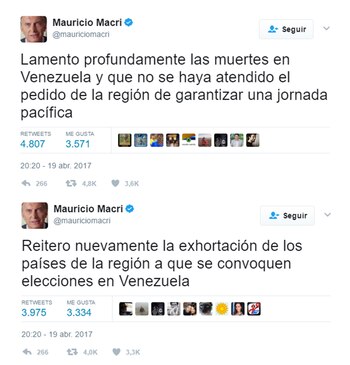 El presidente Mauricio Macri lamentó las dos muertes ocurridas en Venezuela durante la represión de la policía chavista a las masivas marchas opositoras y reiteró su pedido de que se convoque a elecciones en el país caribeño.