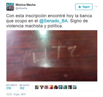 La senadora bonaerense Mónica Macha se encontró ayer con un violento mensaje en el espacio que ocupa en el senado provincial: en su banca estaba tallada la palabra "puta".