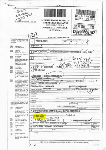 Según consta en el Registro de la Propiedad, la operación se hizo en apenas $900.000, unos 160 mil dólares de ese entonces (la cotización de esa época ronda los $5, 70), muy por debajo del valor real de un coqueto departamento de 236 m2.