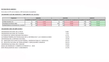 En tanto, los organismos más incumplidores son la Universidad de La Rioja (sólo un 0,88% presentó la declaración de bienes); la Universidad de Tucumán (1,07%); la Autoridad de Cuenca Matanza-Riachuelo (4,17%); la Autoridad Federal de Tecnologías de la Información (16,67%); la Universidad de la Defensa Nacional (18,18%); el ex Ministerio de Planificación (20,51%); el Registro de Trabajadores y empleados agrarios (26,67%); la Universidad del Comahue (30%); el Banco de Inversión y Comercio Exterior (31,82%) y el Ente Regulador de Agua (33,33%).
