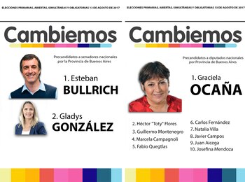 La lista bonaerense de Cambiemos para el Senado será encabezada por el ministro de Educación Esteban Bullrich, secundado por la ex interventora del SOMU y actual titular de la Autoridad de la Cuenca Matanza-Riachuelo, Gladys González, mientras que "La Hormiguita" Graciela Ocaña irá primera en la lista de diputados.