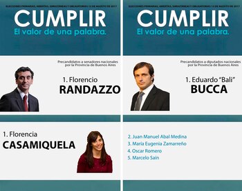 En la boleta para la Cámara alta por el Frente Justicialista Cumplir, Florencio Randazzo estará acompañado por Florencia Casimequela, una abogada especialista en cuestiones de género, mientras que en diputados la lista estará encabezada por el intendente de Bolívar, Eduardo "Bali" Bucca, seguido del actual senador y ex jefe de Gabinete Juan Manuel Abal Medina; la diputada María Eugenia Zamarreño; el sindicalista, diputado y presidente del bloque Justicialista en la Cámara de Diputados Oscar Romero; y el especialista en seguridad Marcelo Saín.