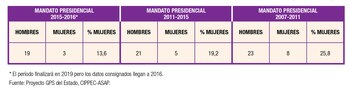 La subrepresentación se replicó en los cargos viceministeriales, donde las mujeres sólo ejercían el 14,1% de las Secretarías de Estado. Por otra parte, el estudio del PNUD señala que sobre un total de 22 carteras ministeriales del Gabinete nacional en 2016, poco más del 10% tenía a una mujer como titular. En los tres últimos períodos el porcentaje de ministras descendió más de 10 puntos, pasando de un promedio de 25,8 % (entre 2007/2011) a 16,6% en 2016.