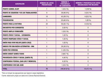 La presencia de mujeres en el Congreso es baja: en 2015 el porcentaje de candidatas fue de 41,8% y el de electas fue de 37,5%. Como se señala en el informe, el punto crítico en Argentina no es que la cuota de género no haya favorecido una mayor elegibilidad de las mujeres, sino que, visto desde un punto de vista paritario, su representación ha llegado a un techo. Esto señala "un escenario en el cual el salto paritario es improbable bajo el mismo diseño". Así, las mujeres ejercen escasos cargos legislativos. Por ejemplo, solo representan el 25% de la Mesa Directiva de la Cámara de Diputados y, aunque presiden un tercio de las comisiones permanentes (31%), están más presentes en aquellas comisiones que se ocupan de la política social y el cuidado (que más adelante se denominan de "reproducción") que en las comisiones que tratan temas económicos e institucionales.
