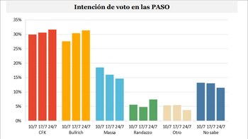 En concreto, la encuesta que maneja el Gobierno -a la que tuvo acceso Infobae– es de la consultora Elypsis y se trata de un estudio continuo de opinión pública iniciado el 10 de julio. En el informe de la última semana de julio la fórmula Cristina Kirchner-Jorge Taiana tiene 32% de los votos frente a Esteban Bullrich-Gladys González que alcanza 31%, pero achicando la ventaja en relación a las mediciones de las semanas anteriores.