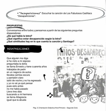 "Conversamos entre todxs y pensamos a partir de las siguientes preguntas disparadoras: ¿de qué habla la letra? ¿Qué significa estar desaparecido según la letra? ¿Qué similitudes hay en lo que cuenta la canción y Santiago?", se agrega como parte del ejercicio.