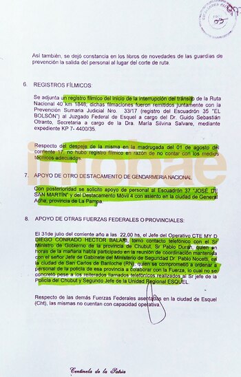 El pormenorizado informe revela también que "a partir del 1° de agosto se encontraba a cargo del personal apostado en la Ruta Nacional 40 en proximidades del kilómetro 1848, lugar del corte de ruta, el Comandante Juan Pablo Escola, segundo Jefe del Escuadrón 36 de Esquel".