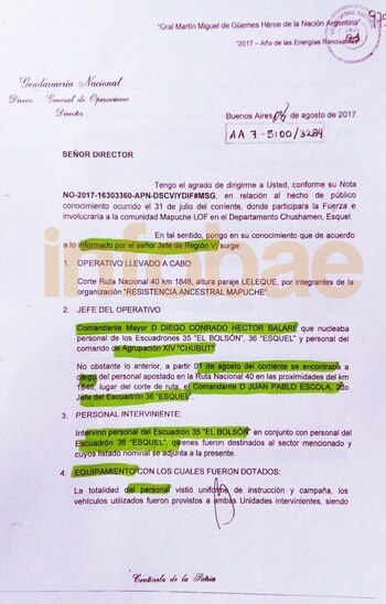 En la foja 1 del documento, y la 975 de la causa que desvela al gobierno de Cambiemos, se informa que el "jefe del operativo" fue el mencionado Balari "que nucleaba personal de los Escuadrones 35 del El Bolsón, 36 de Esquel, y personal de la Agrupación XIV Chubut".
