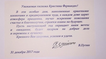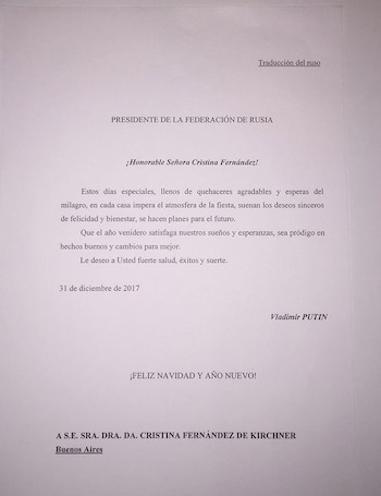 "¡Honorable Señora Cristina Fernández!", comienza el texto del presidente de la Federación de Rusia con fecha 31 de diciembre de 2017. "Estos días especiales, llenos de quehaceres agradables y esperas del milagro, en cada casa impera la atmósfera de la fiesta, suenan los deseos sinceros de felicidad y bienestar, se hacen planes para el futuro", continúa la carta original que llegó en tres versiones: la misiva en el idioma original, la traducción al castellano y una nota del embajador.