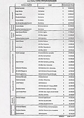 La remuneración bruta mensual de los interventores ya había generado serios cuestionamientos por parte de los afiliados: el trinomio Viola, González, Alonso se llevaba 59.000 pesos por mes cada uno. La directora general, designada por la cartera de Trabajo, $ 55.000. El director de legales, Oscar García Alzueta, un directivo de la Sociedad Rural de Punta Indio, $47 mil. La lista de nombres continúa y los salarios no bajan de los 22.500 pesos. En total, 1,3 millones de pesos mensuales del dinero que aportan los afiliados va a parar a salarios del nuevo "personal" del gremio.