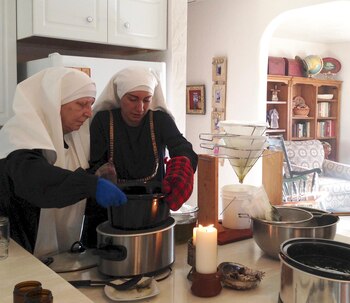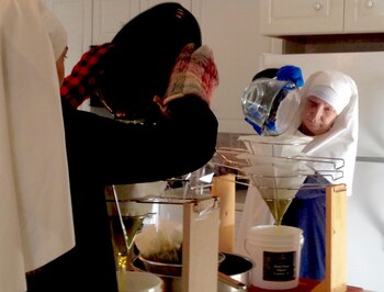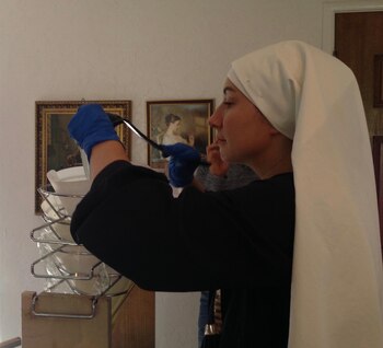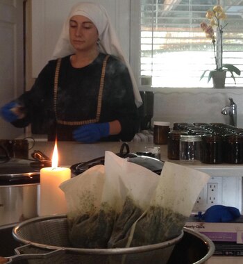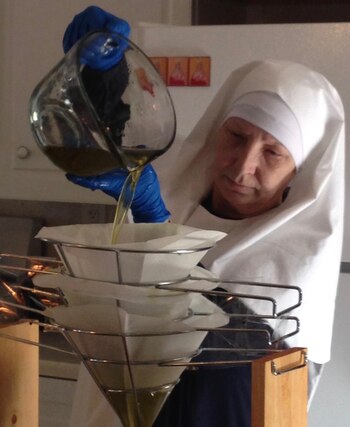 Al costado de la mesa enorme de la cocina, donde caben ocho ollas de cocción lenta cuyas pócimas pasan luego por un filtro triple, el reproductor de música aporta el último elemento para un ritual que comienza con la bendición de las hojas vivas en la tierra. Las monjas queman un atado de salvia sclarea mientras dicen sus oraciones.