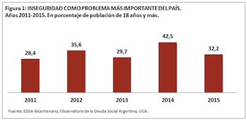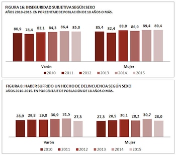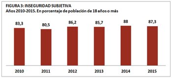 A pesar de la ligera caída en la cantidad de crímenes registrados en 2015, la investigación de la UCA sostiene que se mantuvo relativamente estable la inseguridad subjetiva, es decir, cuando una persona se "siente insegura en su casa, barrio o vía pública y considera una alta probabilidad de convertirse en víctima de un delito". El año pasado, ese número se ubicó en el 87,3%, apenas un 0,7% por debajo de 2014. Según el trabajo, ese porcentaje nunca bajó del 80 en los cinco años investigados.