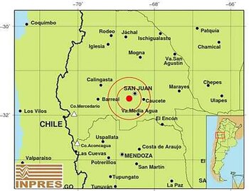 Nuevamente San Juan y Mendoza sufrieron fuertes sismos que repercutieron en Chile y en otras provincias argentinas. Según el Instituto Nacional de Prevención Sísmica (Inpres), el primero de los temblores fue a las 17:57 con epicentro a 36 kilómetros al Oeste de Caucete, a 20 kilómetros al Suroeste de la ciudad de San Juan y a 139 kilómetros al Norte de Mendoza. Fue de una magnitud de 6.5 grados con una profundidad de 130 kilómetros.