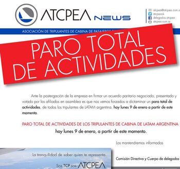El sindicato de Tripulantes de Cabina (ATCPEA) anunció que se levantó el paro mantenido desde las cuatro de la mañana, después de que el Ministerio de Trabajo dictara la conciliación obligatoria entre trabajadores y la empresa. La medida de fuerza se había tomado por el "incumplimiento" por parte de la empresa LATAM de la oferta salarial (incremento del 44%) ofrecida el pasado 22 de diciembre. Por lo tanto se espera la normalización del servicio cerca del mediodía.