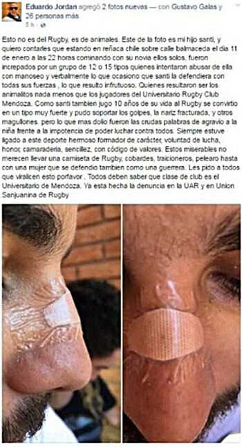 "Quienes resultaron ser los animalitos nada menos que los jugadores del Universitario Rugby Club Mendoza. Como Santi también jugó 10 años de su vida al rugby se convirtió en un tipo muy fuerte y pudo soportar los golpes, la nariz fracturada, como otros magullones. Pero lo que más dolió fueron las crudas palabras de agravio a la niña frente a la impotencia de poder luchar contra todos", posteó el padre.