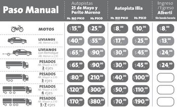 En el caso del transporte de carga, si un camión de 5 ejes ingresa por la mañana a la Ciudad a través de Acceso Norte (Pilar o Campana) y mantiene su horario habitual circulando en la nueva hora de congestión pero se adhiere al sistema TelePASE, pasará de pagar $65 a $168; si lo hace manualmente, el ticket se eleva a 240 pesos. Si en cambio, el camión deja de circular en horario de congestión y comienza a hacerlo en horario Promoción (12 a 16 horas), pasará de pagar $65 a pagar $120 manualmente y $60,90 si se adhiere a TelePASE.