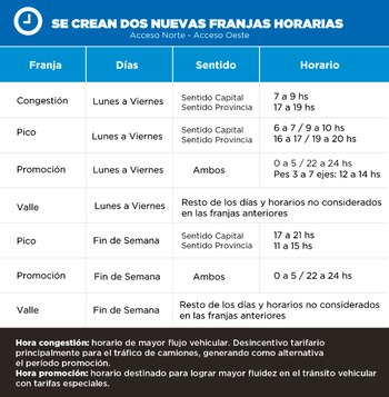 En un principio, de acuerdo con las sugerencias recibidas durante la Consulta Ciudadana y hasta solucionar la congestión que se genera en el Puerto de Buenos Aires, el horario promoción será desde las 12 a 16 horas y de 22 a 5 horas de lunes a viernes en ambos sentidos de circulación.