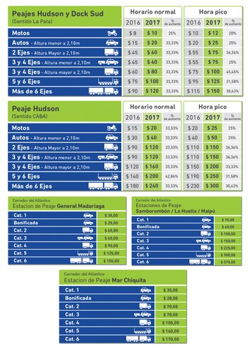Las tarifas de la Autopista Buenos Aires-La Plata y el Corredor del Atlántico también sufrieron ajustes a partir de hoy. Las subas representan un incremento promedio del 33% en el caso de la Autopista de acceso a Buenos Aires y del 66% para las rutas 2 y 11; valores que no eran ajustadas desde mediados de enero de 2016.