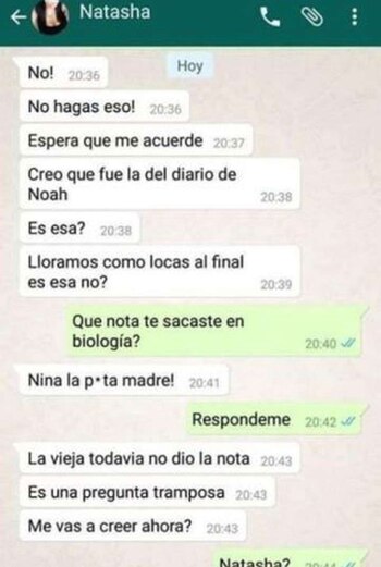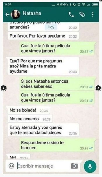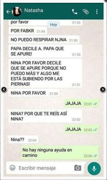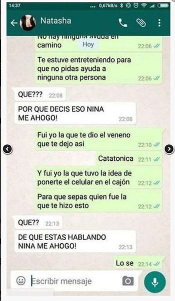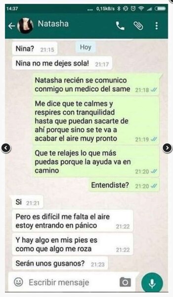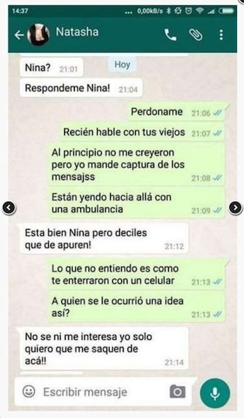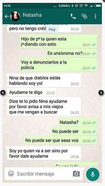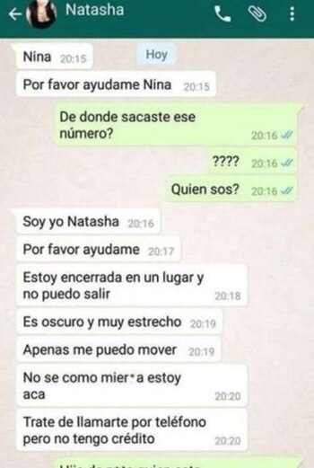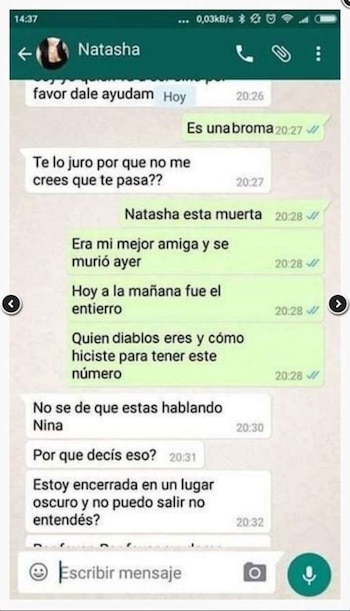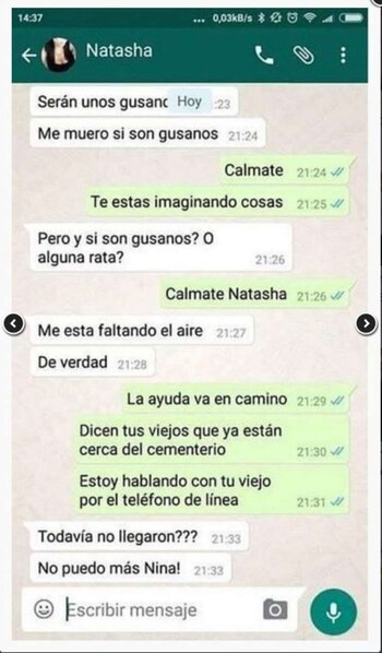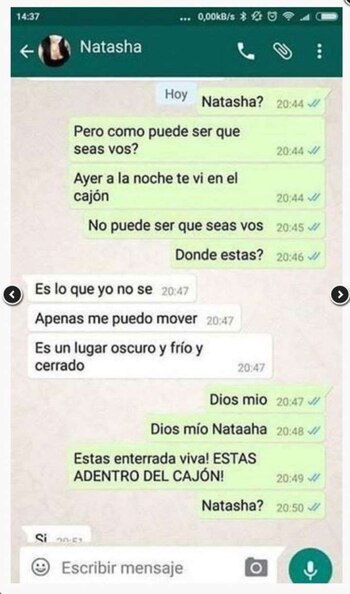 A través de presuntos mensajes de WhatsApp que simulan ser reales, con diálogos redactados en forma natural, con errores de ortografía y emoticones, el artista exhibe una simple conversación entre dos amigas Natasha y Nina que se mensajean en un contexto que poco a poco se torna escabroso, tenebroso y de terror.