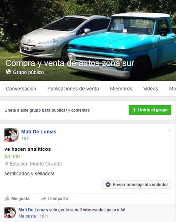 "Se hacen analíticos. $3000 pesos. Sertificados y sellados", dice la publicación, chiquita, sin foto y con errores de ortografía, que pasa inadvertida en medio de autos, motos y videos en un grupo de "Compra y venta de autos zona sur", pero que está ahí para el que la sepa ver.