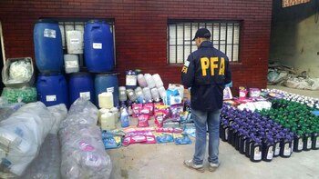 Había gran cantidad de material tanto envasado como suelto que fue suficiente para llenar tres camiones, un lote valuado en un millón y medio de pesos. Hubo siete detenidos, que recuperaron su libertad en las últimas horas. Los dos puntos restantes que la PFA allanó luego de los puntos de venta fueron, precisamente, las pequeñas fábricas clandestinas, una sobre la calle Granaderos en Hurlingham y otra en la calle El Parque, Tres de Febrero, equipadas con tanques.