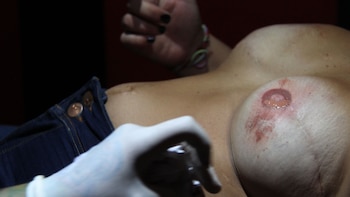 Verónica Pelisari tiene 40 años y entra al box haciendo chistes. Se saca la remera y se desabrocha el corpiño, muestra las mamas cruzadas por cicatrices y sin pezones y dice que "no se sabe si es el pecho o es la espalda". Diego le dice que no le va a hacer "dos escarapelas", redondas y simétricas, sino algo "más realista". El empieza y ella, que no siente dolor, habla.