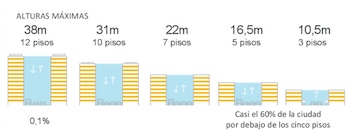 De aprobarse los nuevos códigos, la altura estará determinada ya no por el tamaño de la parcela, sino por la ubicación del lote: sobre las avenidas más anchas será posible construir hasta 12 pisos, mientras que a medida que la calzada es menor en avenidas y calles, también serán menores los límites de alturas, con un mínimo de 3 pisos en algunas calles y pasajes. La altura permitida para cada parcela podrá consultarse de un modo sencillo a través de la web.