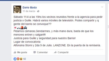 "Pidamos cámaras, gendarmes, y más mano dura, basta de que los menores entren y salgan", publicó cuando reclamaba "justicia para Guille y seguridad para el barrio".