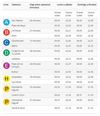 La propuesta conjunta del Ministerio de Desarrollo Urbano y Transporte y Subterráneos de Buenos Aires contempla cubrir el servicio de todas las líneas desde las 5.30 hasta las 23:30 de lunes a viernes, y de 6 a 24 los sábados. Los domingos se mantendrá el horario habitual desde las 8 hasta las 21.30/22, dependiendo de la línea.