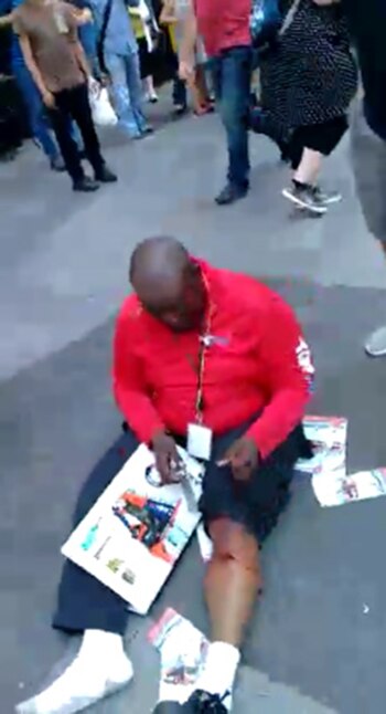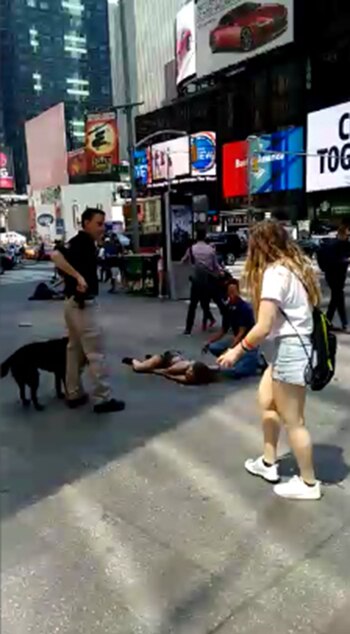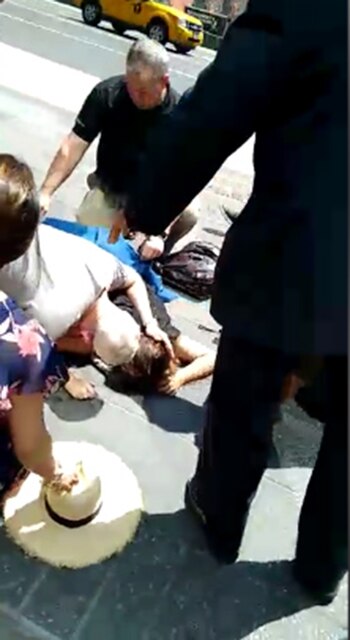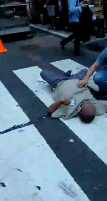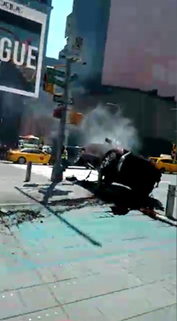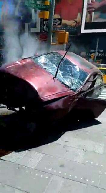 "Me salvé de pedo, me salvé de pedo. Vino un auto en contramano, por la vereda, a todo pedo", describió visiblemente alterado mientras caminaba por la esquina más popular de la Gran Manzana.