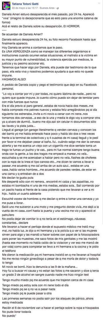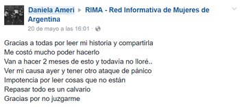 Las últimas frases de su texto son el retrato de su dolor y el de tantas otras mujeres: "Las primeras semanas no podía salir por los ataques de pánico. Ahora estoy medicada. Recién el 6 de noviembre van a hacer el peritaje sobre la ropa e hisopados. No pude llorar todavía. No puedo".