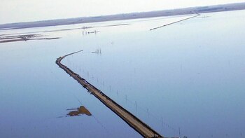 Un video que fue filmado desde un avión y publicado en medios de esa provincia muestra cómo la Ruta 7 quedó tapada de agua, pese a las toneladas de piedras que se colocaron para protegerla.
